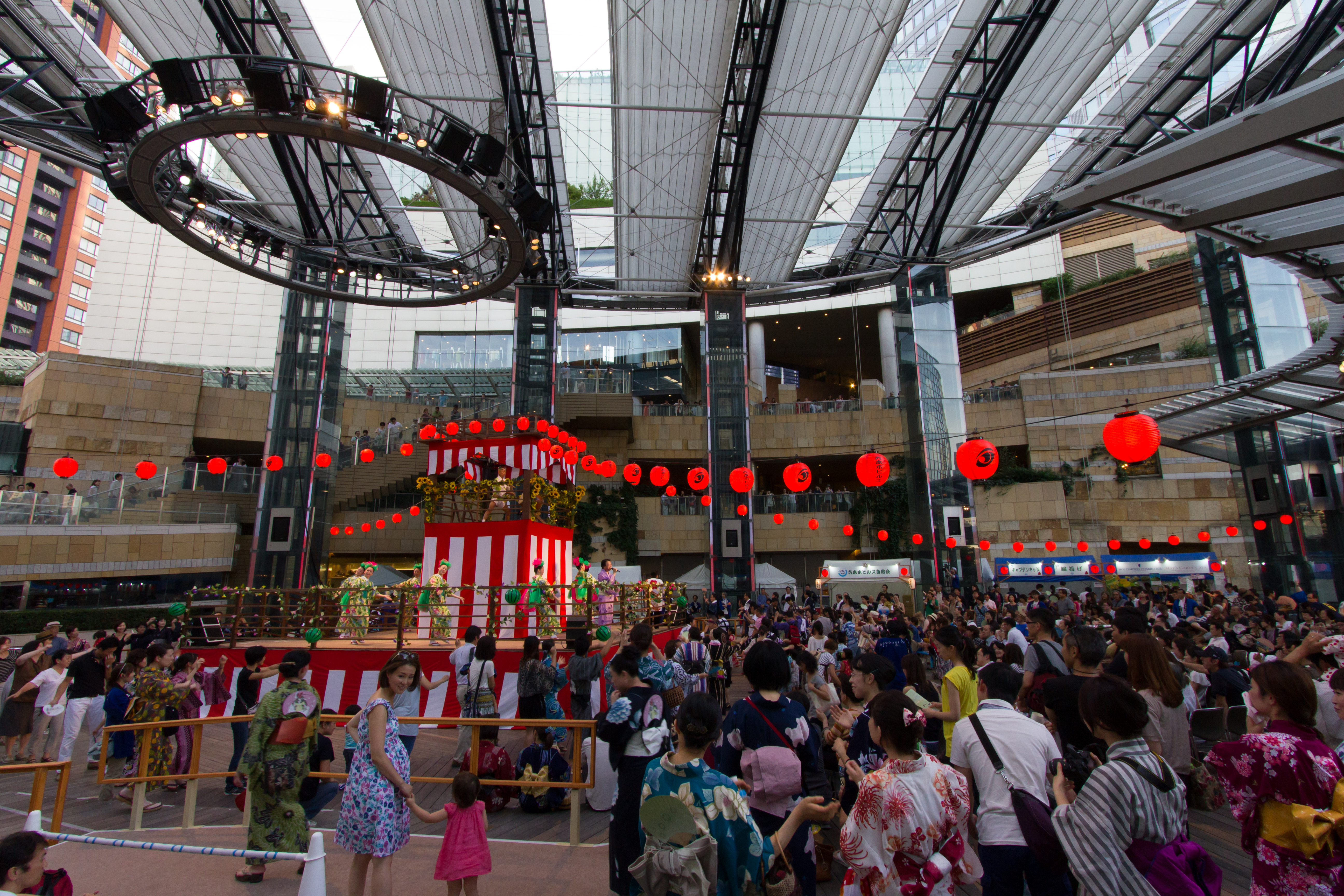 Op het podium (de yagura) staan een zanger, een trommelaar, een instructeur en danseressen